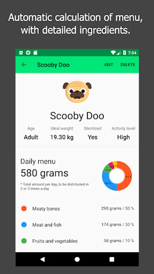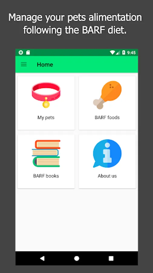 This application allows you to manage all your pets, and advises you a detailed menu based on the species, age, weight and other parameters. It is a BARF calculator to obtain the orientative amount of food that your dogs, cats or ferrets should take.