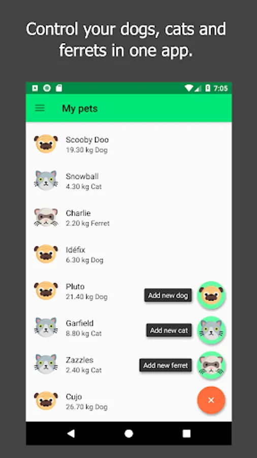 - Manage all the animals of the family, whether dogs, cats or ferrets. The data remains stored on your device for you to consult whenever you want.