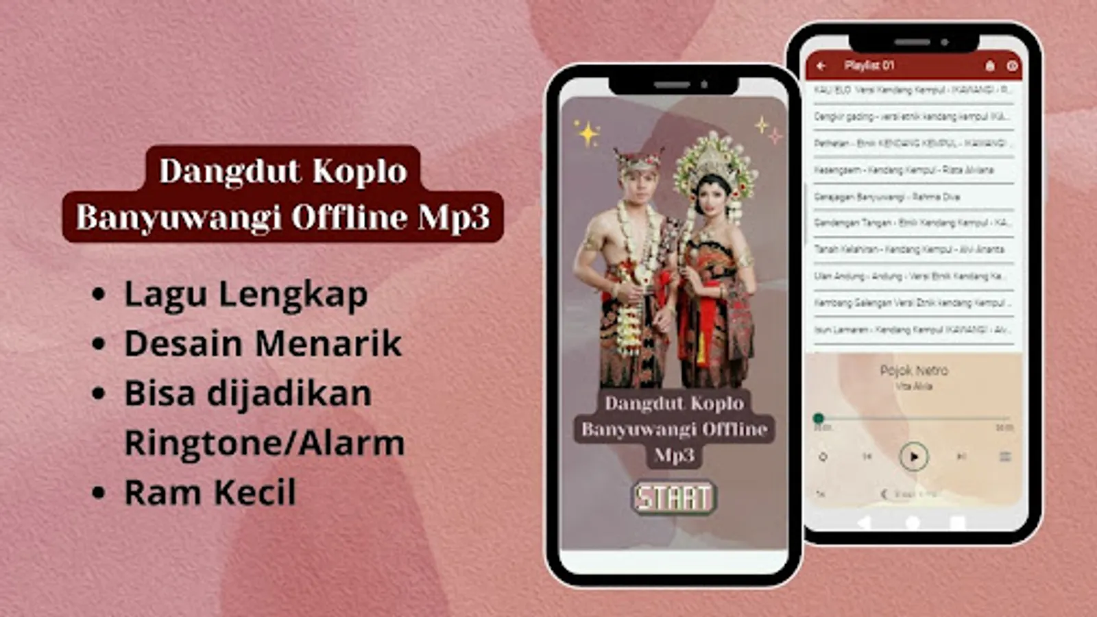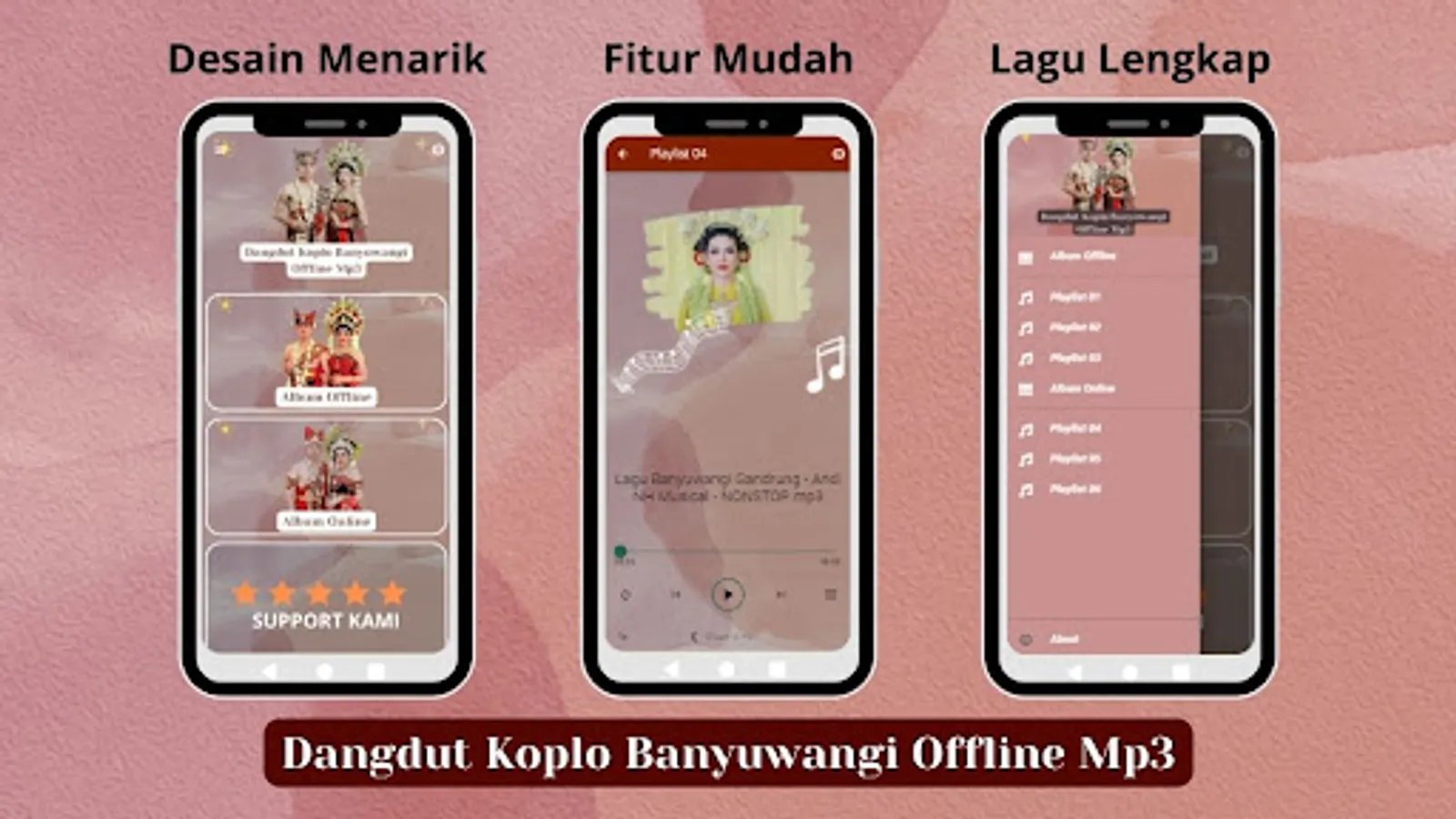• The Most Complete Collection: Enjoy thousands of Banyuwangi Dangdut Koplo songs in various variants such as Campursari and Kendang Kempul. This app is the best source for all your favorite Banyuwangi songs.