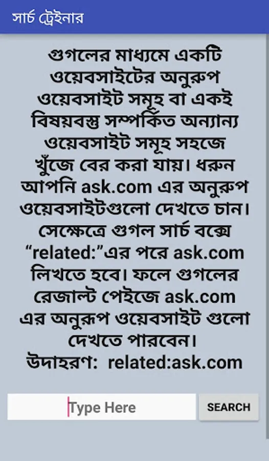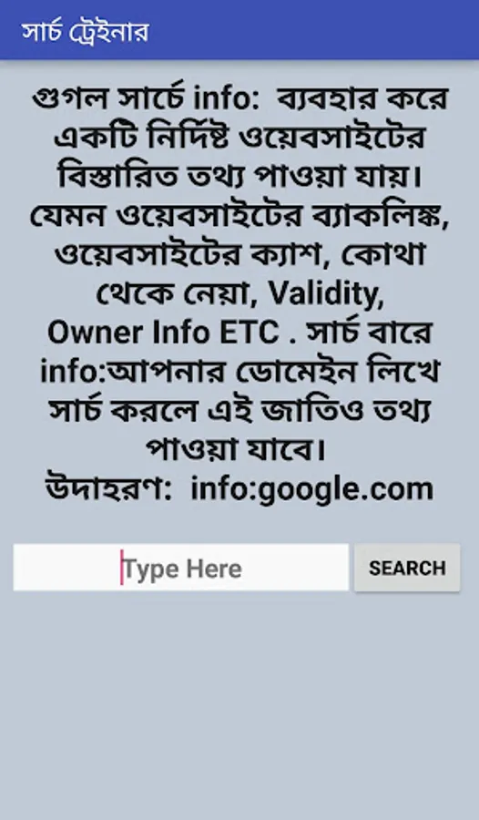 By Using This App U Can Learn All About The Rules (Tips and Tricks) of Searching. I hope It will Help You to Increase your Searching skill.
