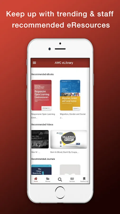 AWC eLibrary serves its users with mobile, on-the go access of a massive collection of over 100,000+ eResources and information feeds including: