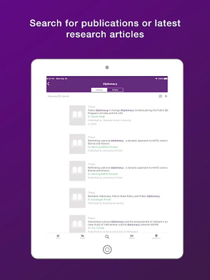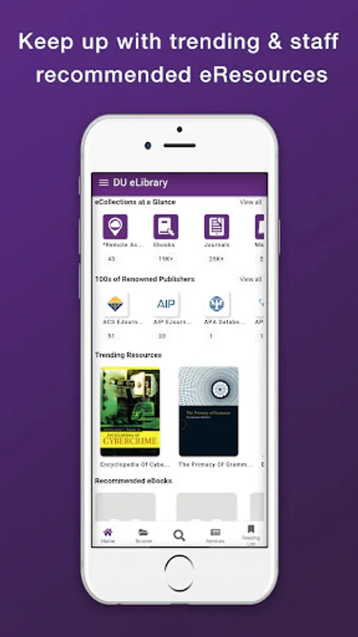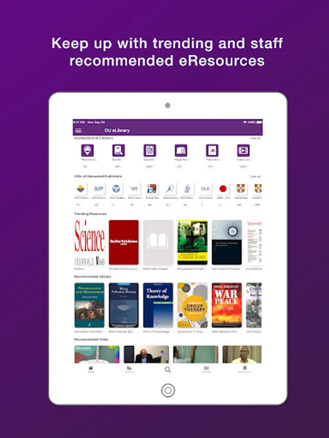 Delhi University eLibrary App serves its users with mobile, on-the go access of a massive collection of eResources and information feeds including: