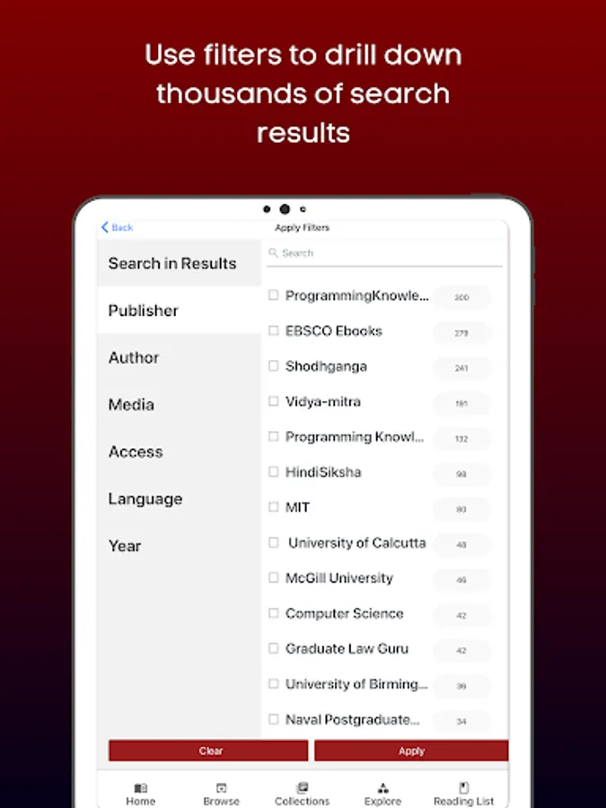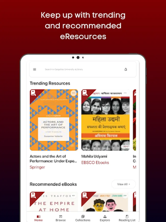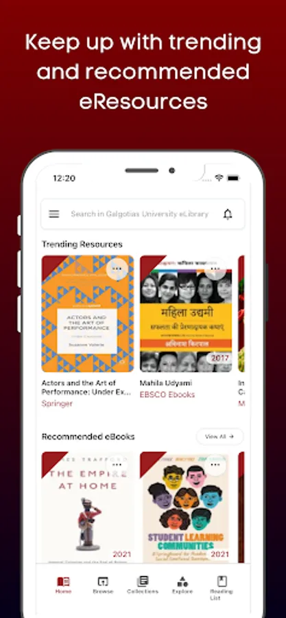 Galgotias University eLibrary App serves its users with mobile, on-the go access of a massive collection of eResources and information feeds including: