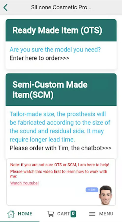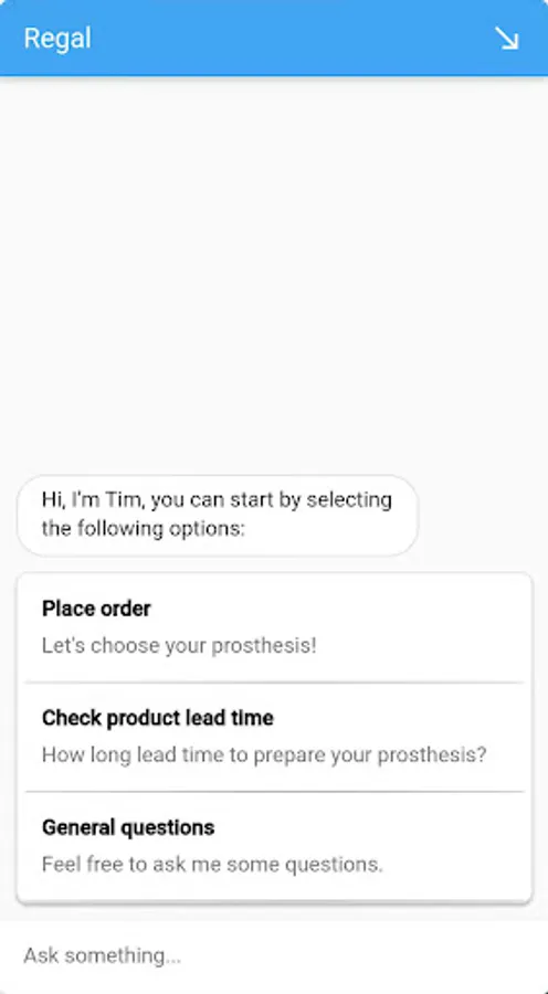 This APP serves the CPO to place orders to Regal Prosthesis ready-made and semi-custom-made silicone prostheses, lower limb components, and orthotic & rehabilitation products. The APP incorporate a Chatbot which will guide practitioners through every step to select the right silicone prostheses for the patient.
