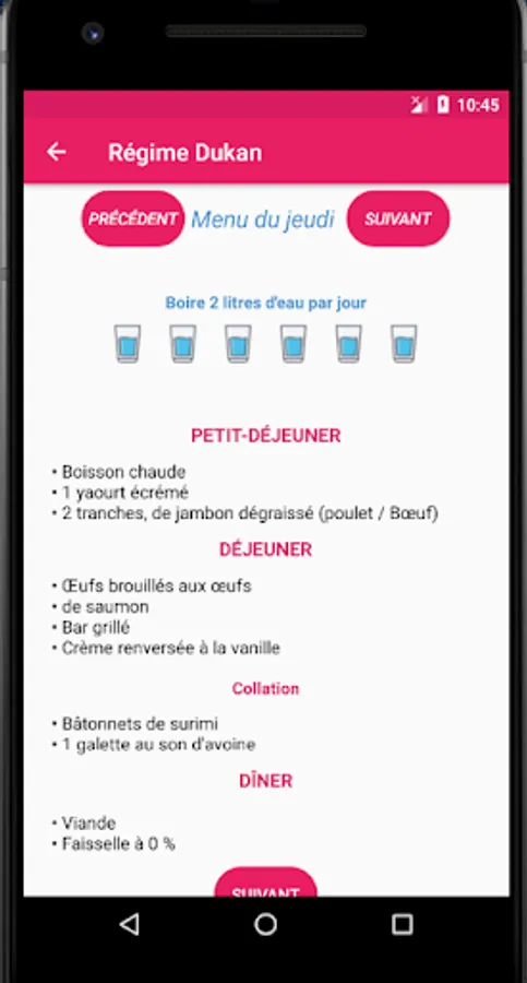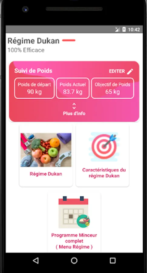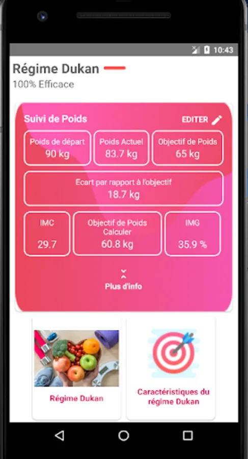 The application allows you to view your progress in the form of a BMI gauge, a weight table and a graph. You see your daily goal, the weight lost, the weight left to lose, the number of days of diet elapsed and remaining.