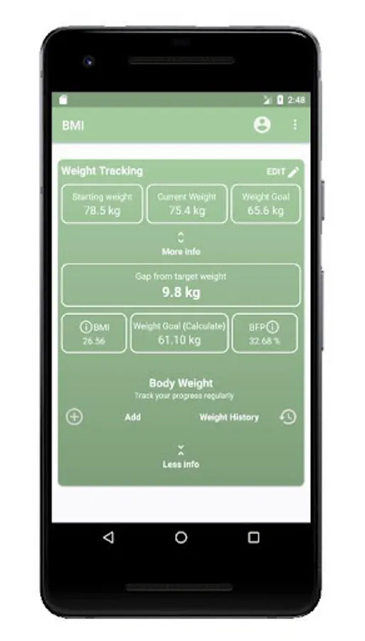 • Analysez votre historique de poids dans divers graphiques et visualisations pour obtenir des informations sur le chemin vers une meilleure image corporelle