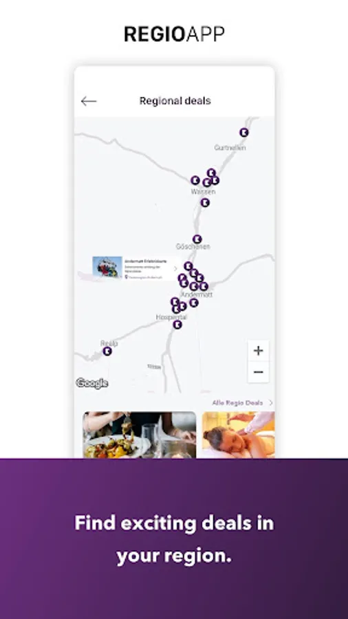 Deals in your area are marked with a “K” on the map. Regional deals can be redeemed locally at the point of sale using the app code.