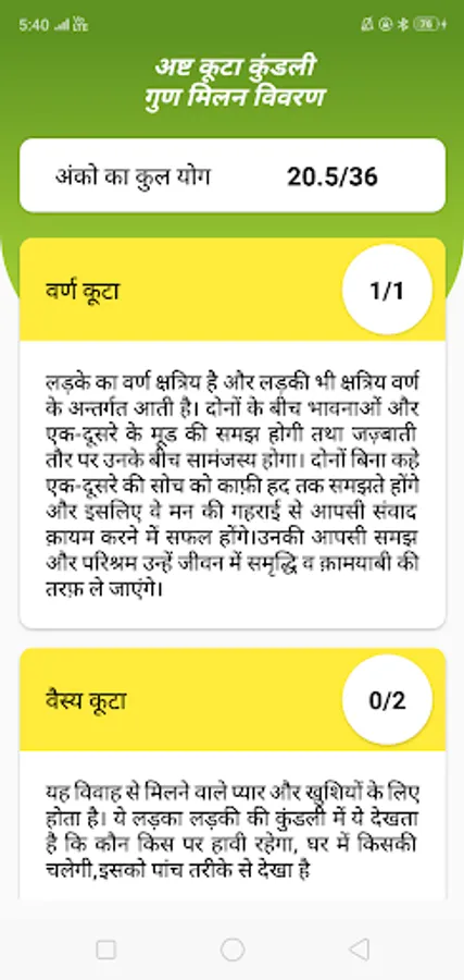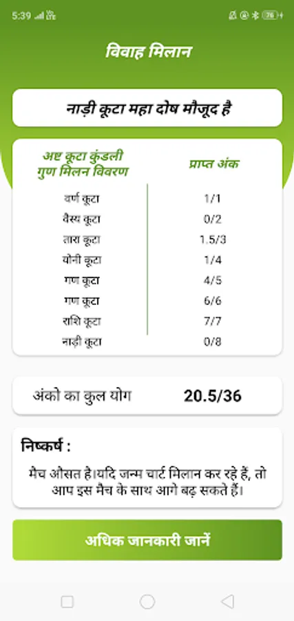 This absolutely free app kundali match / kundali app in hindi language gives the marriage match information based on 8 matching method which is followed by north Indian astrology.