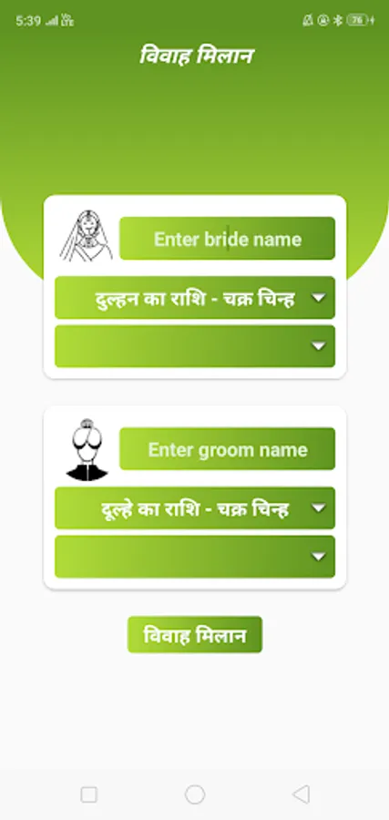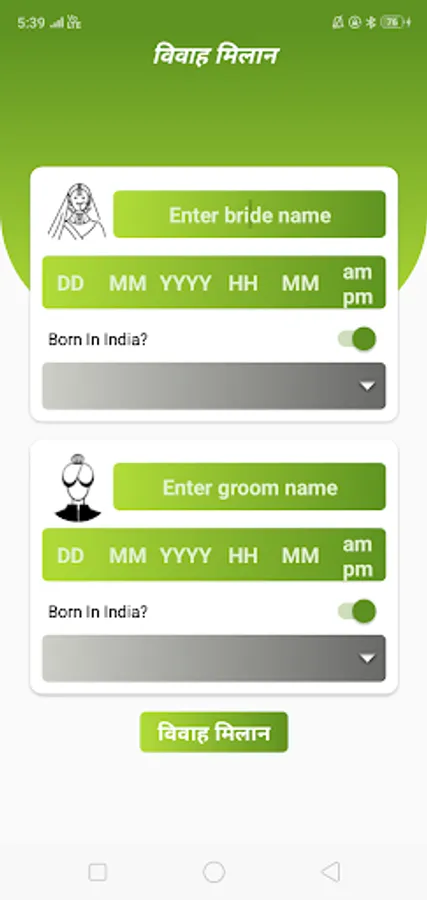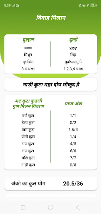 This kundali milan app uses bride and groom’s rasi and nakshatra to calculates vivah kundali milan out of 36 points. If points is greater than 28, then the pair have perfect match to get married.