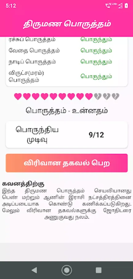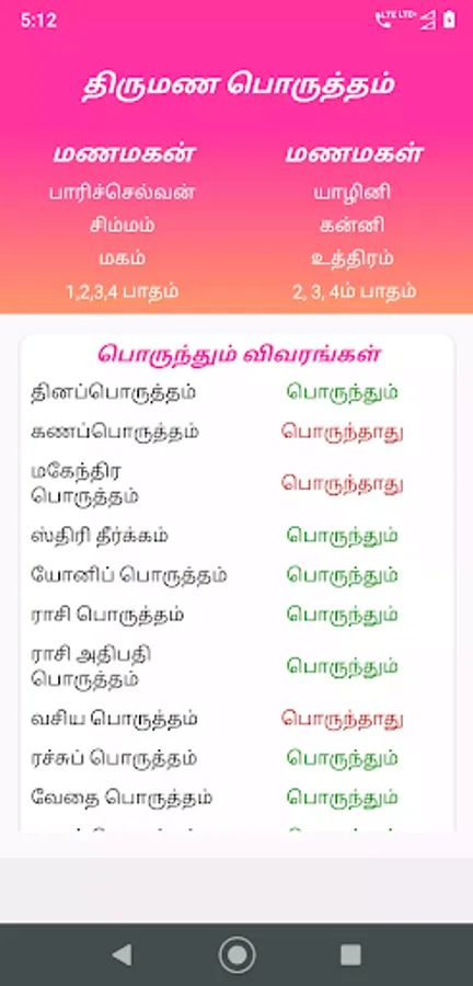 This thirumana porutham app includes 12 types of marriage matching with the help of a girl and boy rasi and natchathiram.