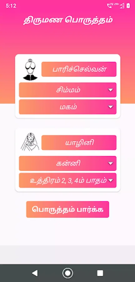 This thirumana porutham app is completely free for Tamil traditional marriage matching. Just enter the girl's name with rasi and natchathiram then, register the boy's name with the rasi and star. It gives you the matching based on the star and rasi.