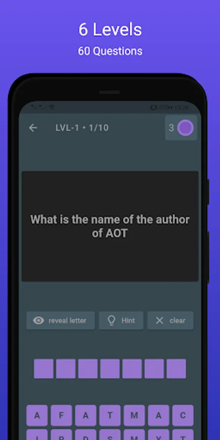 AOT quiz contains 6 levels, each level contains 10 questions, for a total of 60 questions.