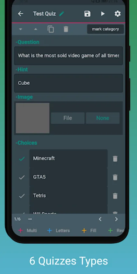 -6 types of quizzes items: (Multichoice, Letters, Fill, Reorder,Match,+Text"for infos").
