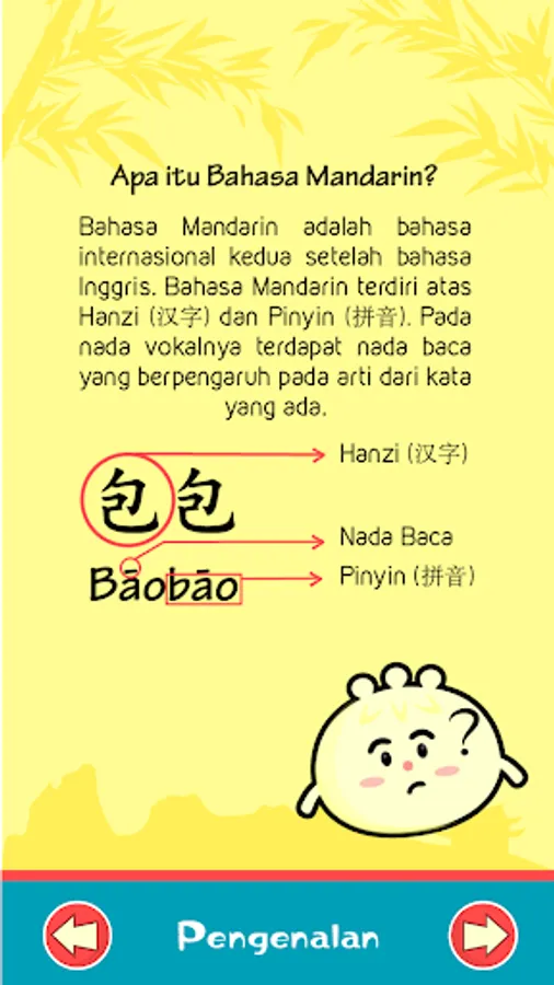 Baobao - Chinese Vocabulary App adalah sebuah media pembelajaran interaktif kosakata bahasa Mandarin untuk pemula. Secara garis besar konten yang dimuat adalah tentang kosakata dasar bahasa Mandarin yang dilengkapi dengan suara (cara untuk melafalkan), desain yang simple dan modern, dan mini games untuk menguji kemampuan belajar. Diharapkan dengan adanya media ini dapat membantu pemula dalam menghapal dan belajar kosakata bahasa Mandarin dengan lebih baik dimana saja dan kapan saja.