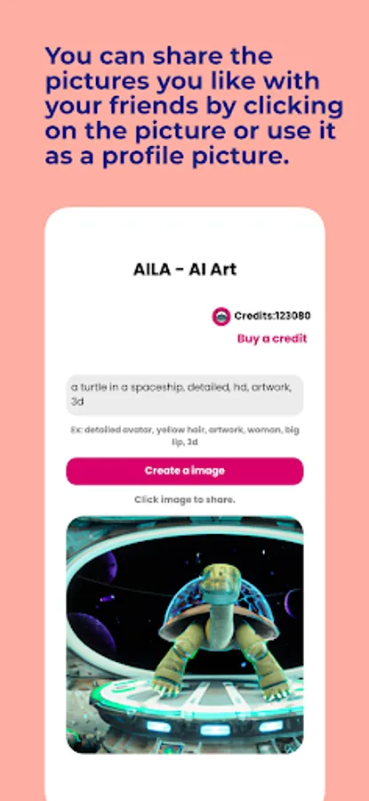 AI Art Generator app enables the art of creating images using text data. This feature allows users to use text data (for example, word, sentence or paragraph) in conjunction with the artificial intelligence system to create unique and creative images related to the text data.