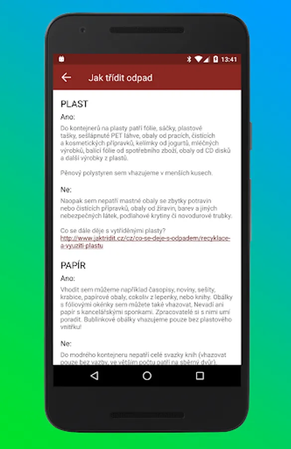 The mobile application allows you to report a crowded or damaged container in your city. The application also provides complete information about recycling.