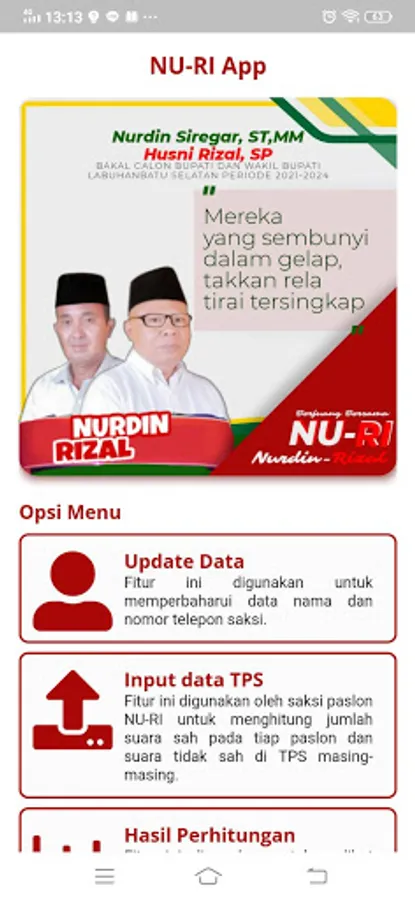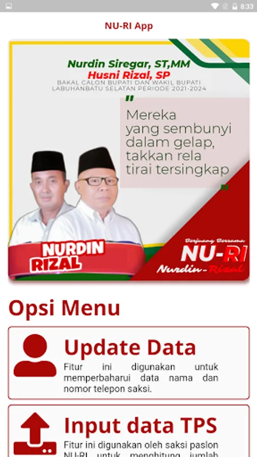 NURI APP is an application to accelerate election vote information in South Labuhanbatu made by the success team of candidate pair Nurdin-Rizal (NURI) with serial number 01.