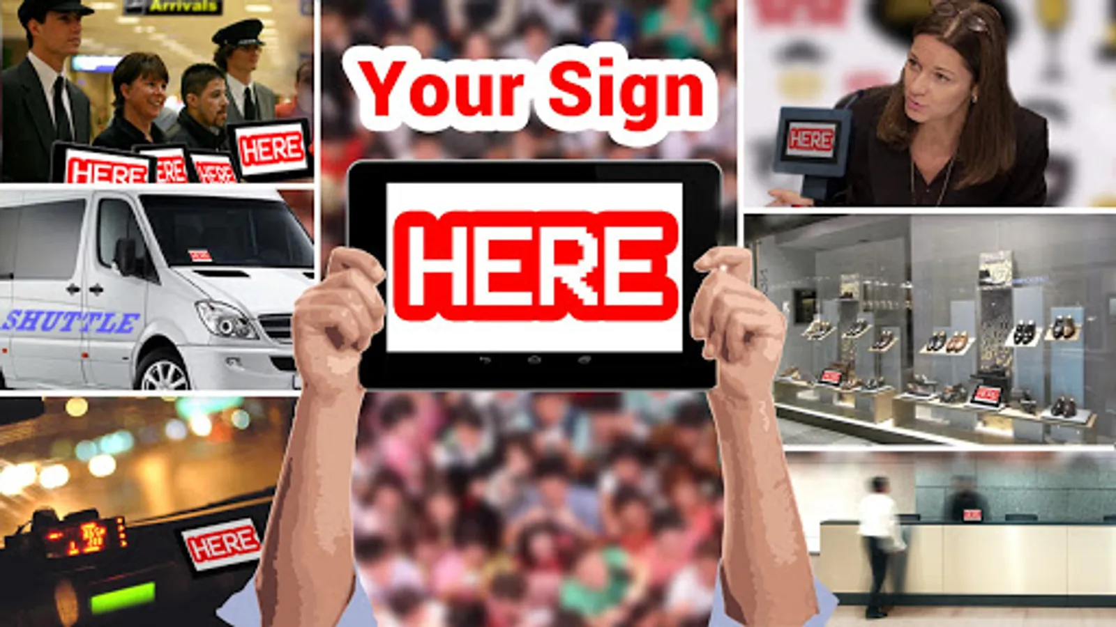 Your Sign Here can be used to pick someone at the airport, in a press conference, in your hotel reception, in your shop window or just for fun.