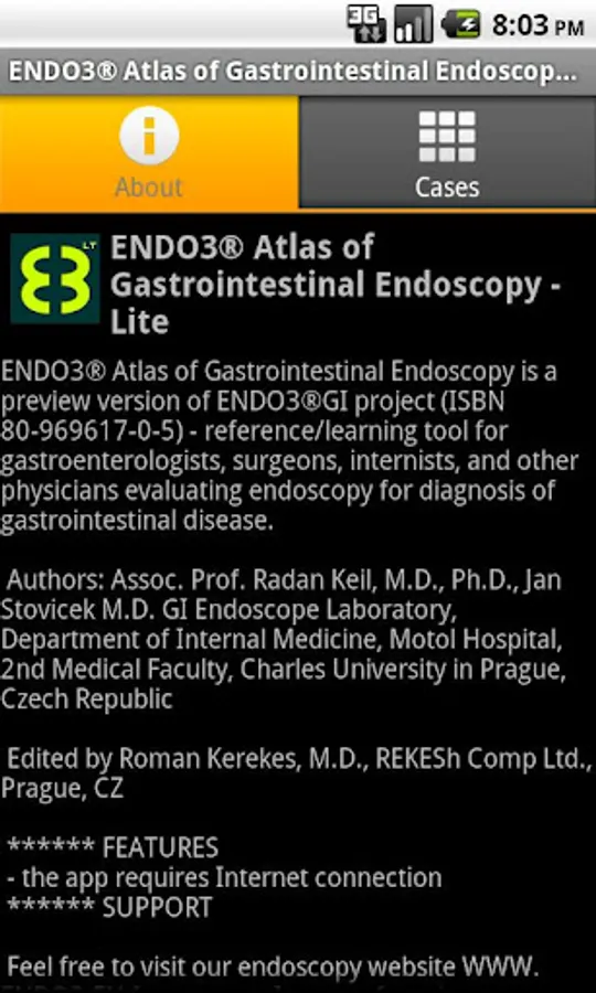 This app is a Lite version of ENDO3® Atlas of Gastrointestinal Endoscopy, endo3®GI project (ISBN 80-969617-0-5) - reference/learning tool for gastroenterologists, surgeons, internists, and other physicians evaluating endoscopy for diagnosis of gastrointestinal disease.