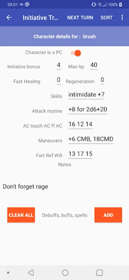 An initiative tracker that allows you to manually add the initiative, name, hp, notes, and number of rounds for (de)buffs and spells and more.