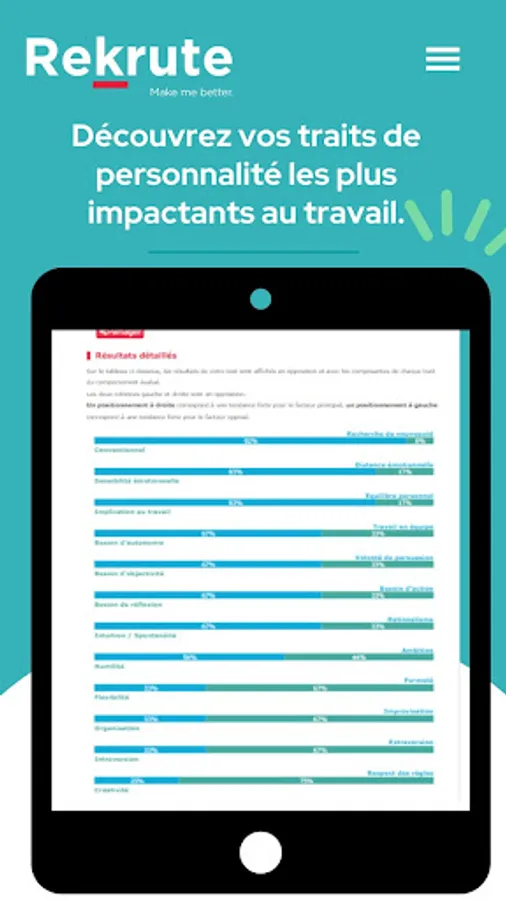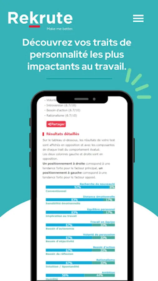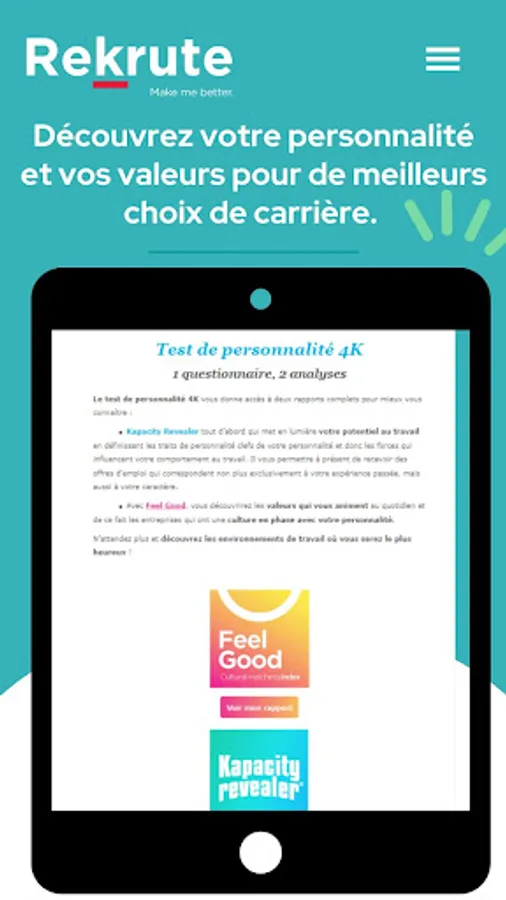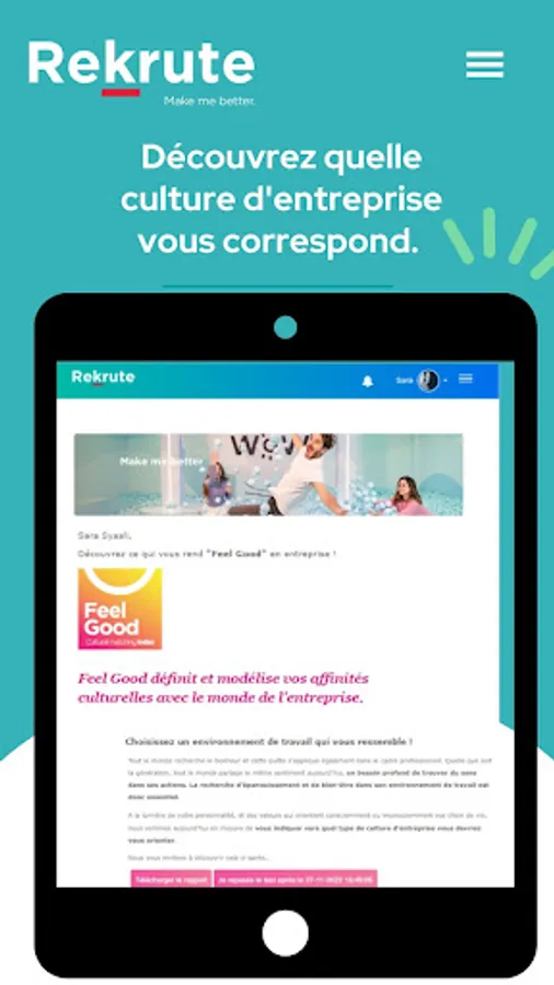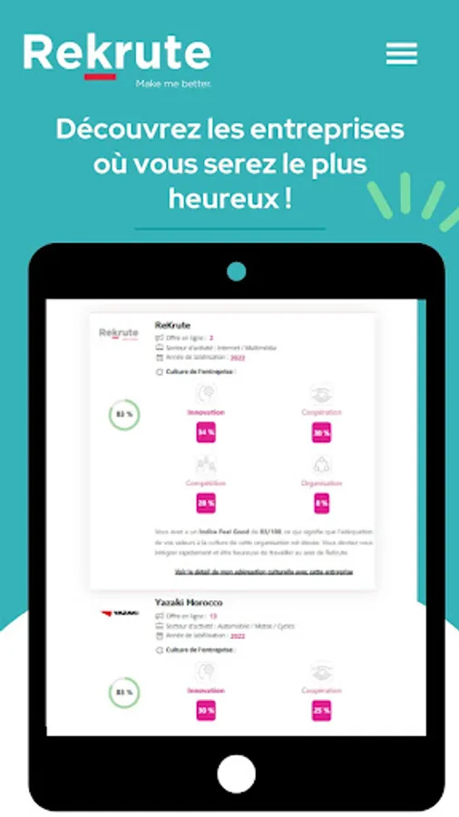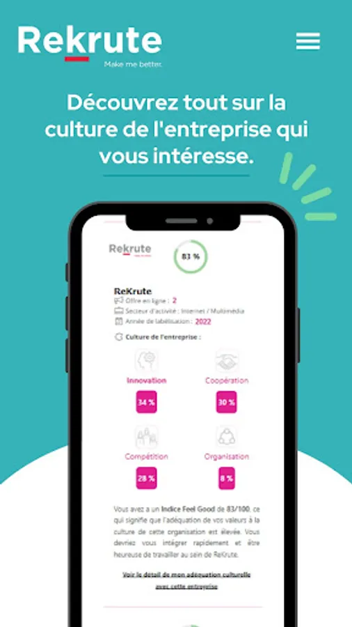 - Continuous innovation: so that each candidate finds the professional environment that suits them best, we have provided them with free personality tests to get to know themselves better and enhance their profile, a ranking of the most attractive companies on the market , or even a listing of those who work on the happiness at work of their employees; tools that allow you to know how to position yourself personally in relation to the corporate culture of recruiters, a salary simulator, etc.,