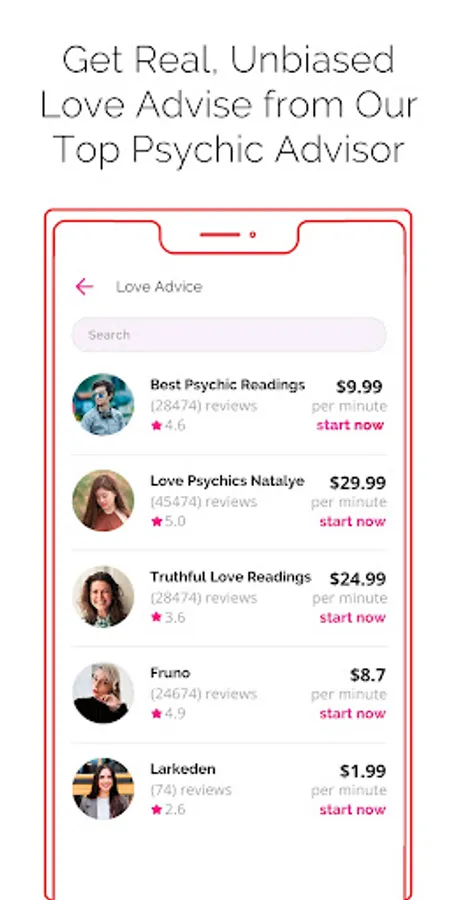 * Detailed profiles listing of expert psychic readers that offer love & relationship advice