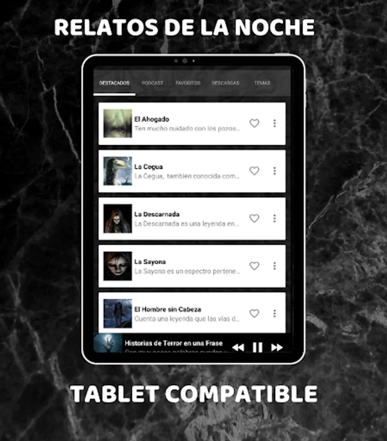 Con Relatos de la Noche tendrás las mejores historias y leyendas urbanas, prepárate para darte un buen rato escuchando las historias más aterradoras y de miedo, con nuestra aplicación Relatos de la Noche. En la tradición de los clásicos de la radio, aquí se cuentan las historias, relatos y leyendas que habitan las calles de México e Iberoamérica. Existe una frontera entre la fantasía y la realidad que se desdibuja para alimentar nuestro miedo, donde lo imposible es impredecible y el terror es espejo de tu realidad