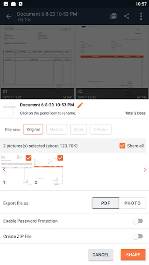 - Select size/quality of document before share