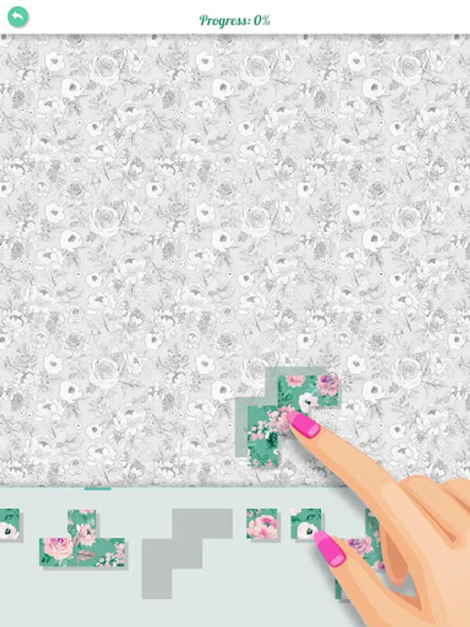 Each pattern starts with a black and white sketch, and you must put the jumbled pieces together correctly. Piece by piece, each pattern becomes colored and relaxing music begins to play. When the last piece is placed, the pattern fills the screen completely.