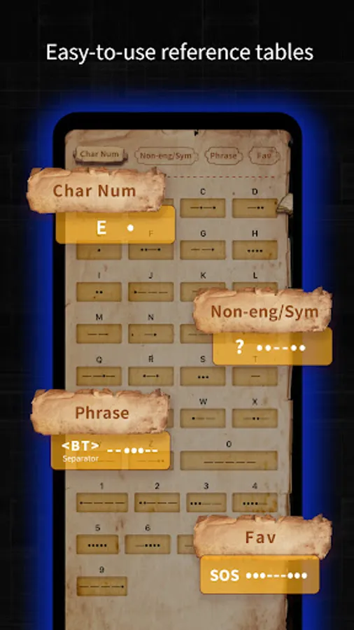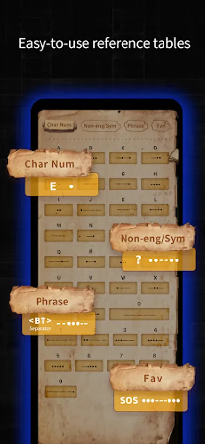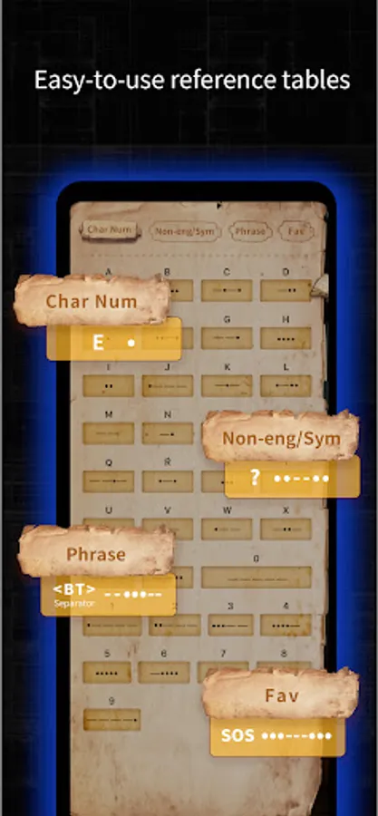 • Complete Alphabetic table with corresponding Morse Code for easy encoding.