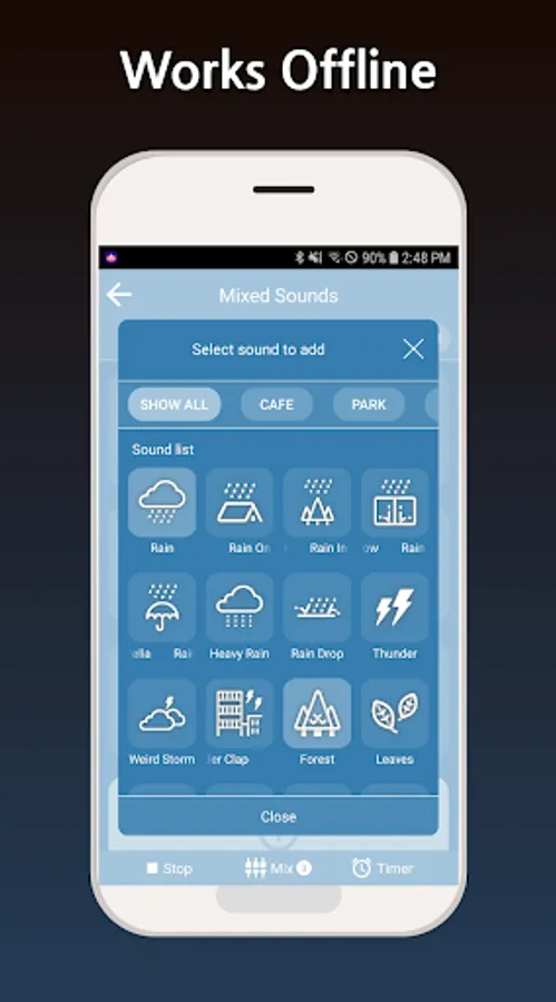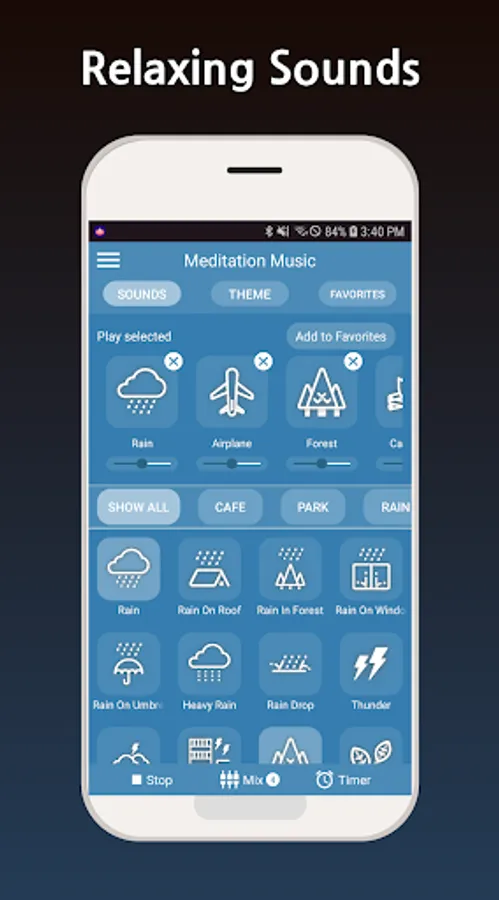 Take a comfortable rest with through Study, Library, House, Cafe, Park, Rainy day, Musical instruments, Relax, Machine and White noise.