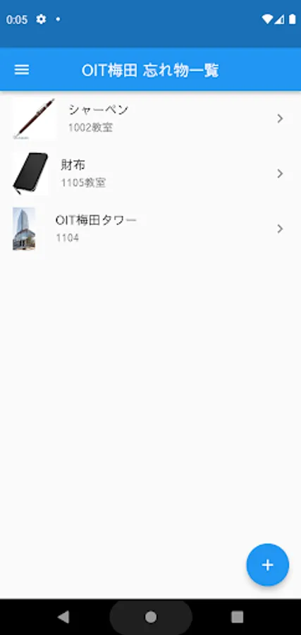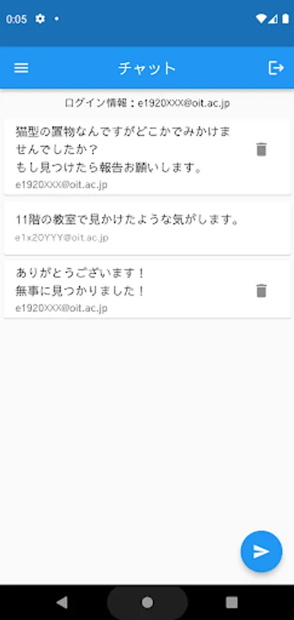You can share and check information on lost and found items on the Umeda Campus of Osaka Institute of Technology. You can check the lost item list, and you can register / delete the lost item yourself. You can also share information in text using the chat function.