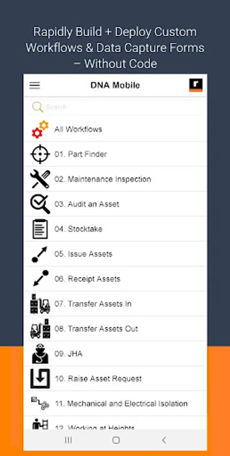 • Build and deploy – without code – custom workflows to mobile devices such as audit, inspection, stocktake, service, issuance, receipt, JSA, JSEA and more (configured in cloud application)