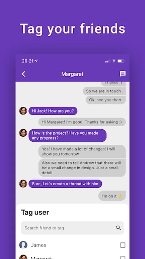 Message tag is new generation messaging app for everyone. It allows you to chat with your friends and tag other users from chat with different user. This function is called threaded messages. Inside this thread you can both chat with users that you tagged before. App allows you to add your friends with phone number.
