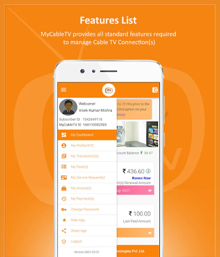 "MyCableTV" India's first Digital platform for Digital Cable TV subscribers to get connected with their Local Cable TV Service Providers. Users can use this platform to manage their Digital Cable TV Set Top Box Connections, Raise service requests, Make Monthly Subscription Prepaid/Postpaid payments Online, View Invoices and Payment History, Manage Account Details, etc. More with MyCableTV Subscribers can :