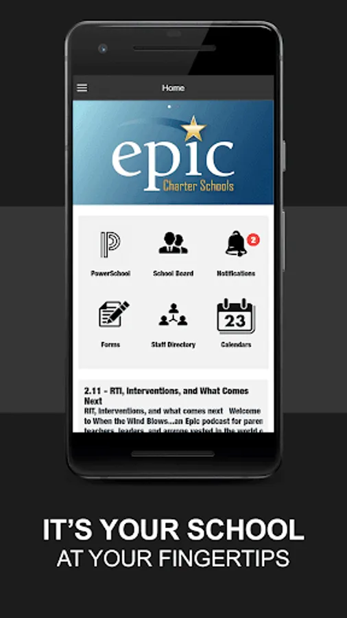 With the Epic Charter Schools mobile app, your school district comes alive with the touch of a button. Easily navigate through current news and events or check out the latest updates with social media. Quickly retrieve contact information, sporting scores, lunch menus, and more! It’s your school district available at your fingertips.