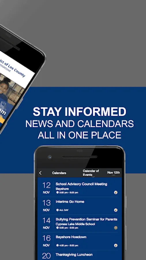 With the School District of Lee County mobile app, your school district comes alive with the touch of a button. Easily navigate through current news and events or check out the latest updates. Quickly retrieve contact information, sporting scores, lunch menus, and more! It’s your school district available at your fingertips.