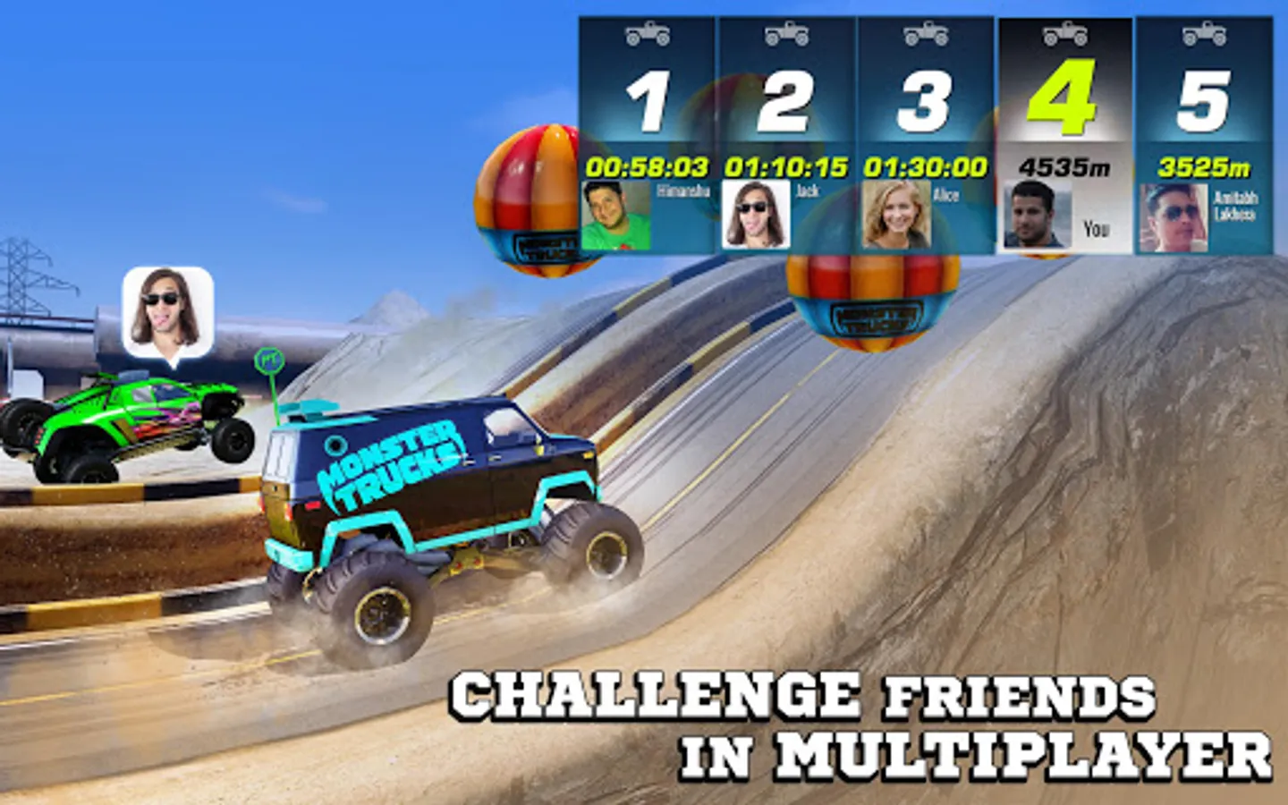 Compete with friends to Top the Leaderboard. Challenge players across the globe to become the world champion in multiplayer races. Race off your friends in Hot Monsters wheels.