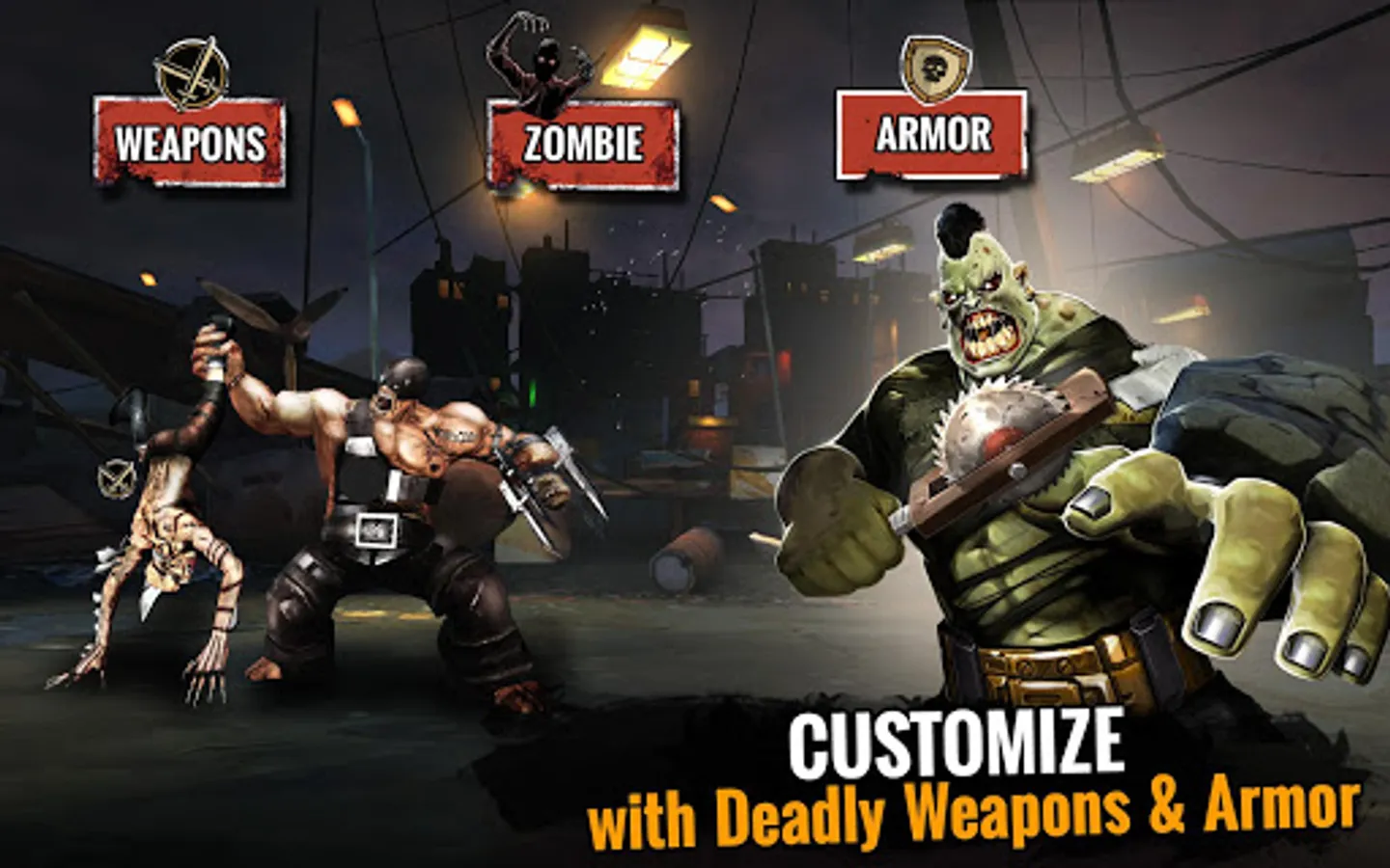 Your mission is to create your Zombie fighting team with an array of bone-crushing weapons and take on the undead in gruesome pit fighting leagues. Collect three classes of zombies with unique skills, strength, power, attacks, and agility to defeat mighty opponents.