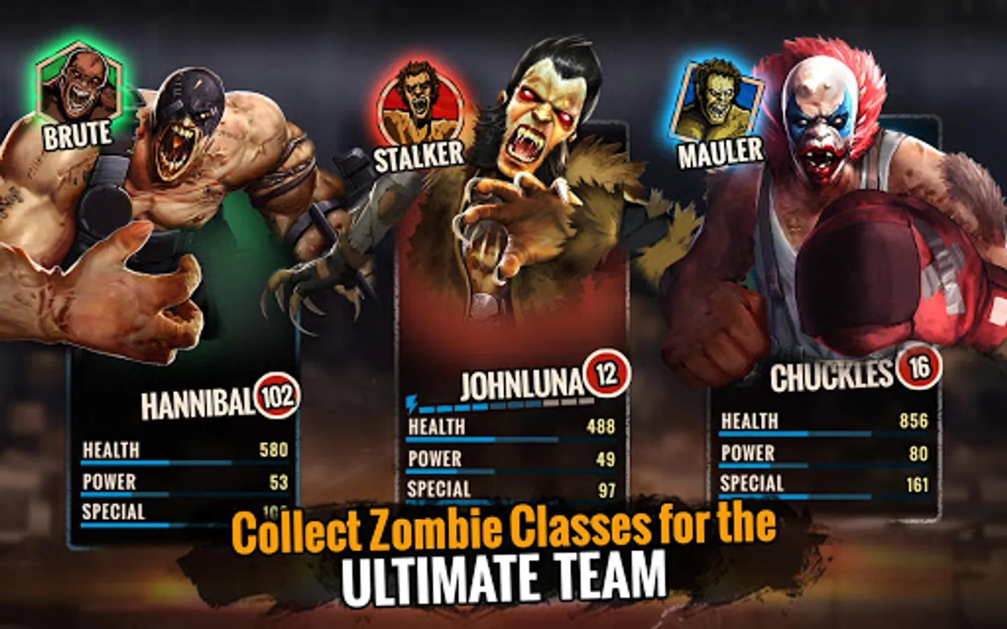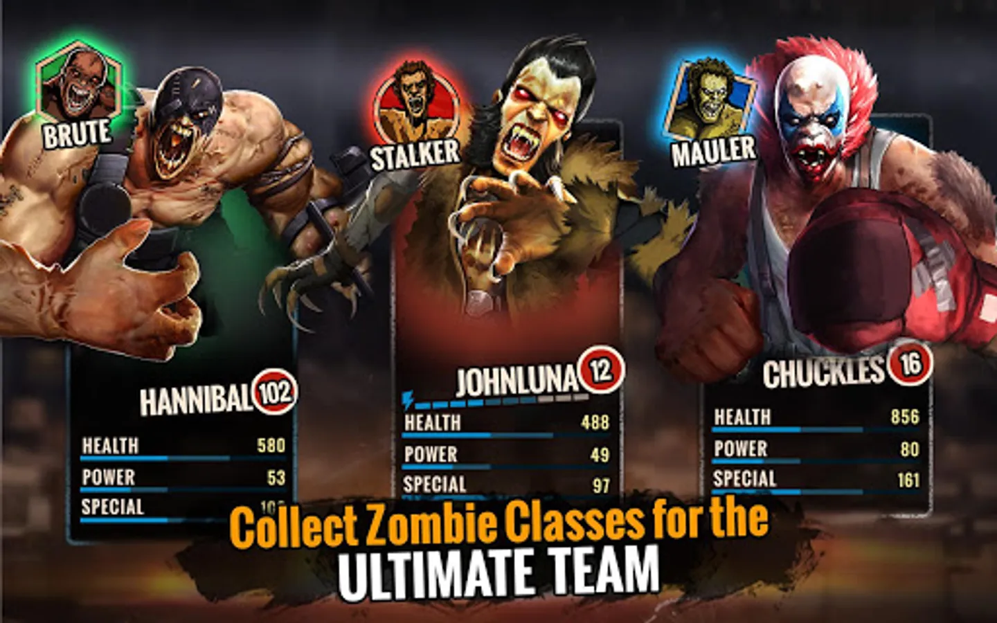 Combine Brute, Mauler & Stalker classes in your zombie fighting team to win. Unleash the sheer thrashing power of Brutes against Maulers. Take down any Stalker with extreme health and agility of a Mauler. Use Stalkers to mow down Brutes with fast and special attacks.