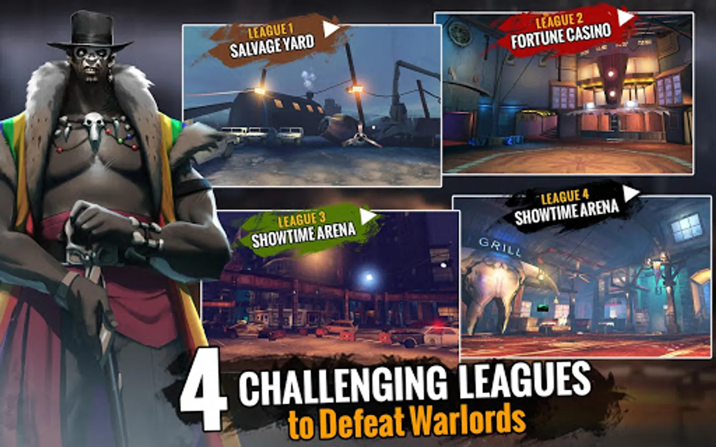 Journey through four intense Fighting Leagues and defeat mighty zombie bosses to become the ultimate champion.