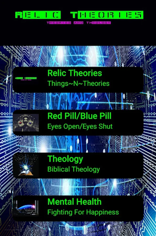 This app is for information purposes (only), for those interested in Conspiracy Theories and studies of the Bible. Interpretations of the Bible are not geared towards any church denomination, but only the opinions of the app developer. Blogs and post are written by the app/website developer (Marlon Robinson) to share with likeminded people over 10 years of research concerning Biblical views and Conspiracy Theories. Portions of reading material and blogs are opinion based, included with research sources. New blogs and post are only in the (Relic Theories tab) within the app, with live feed updates done twice a week pertaining to different topics. Other tabs in the app are brief summaries of that particular topic with a website link for blogs, only pertaining to that topic. Hope you find this information useful!