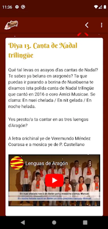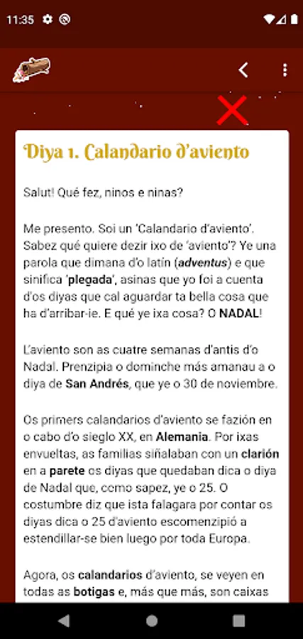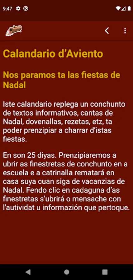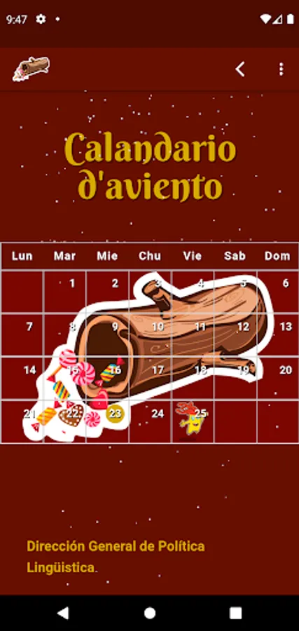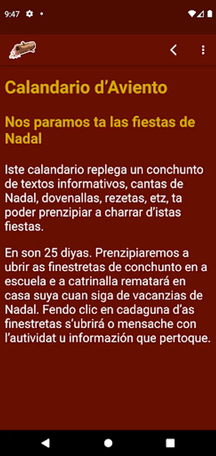 An interactive advent calendar that includes a set of informative texts, Christmas songs, riddles, recipes, etc. in Aragonese.