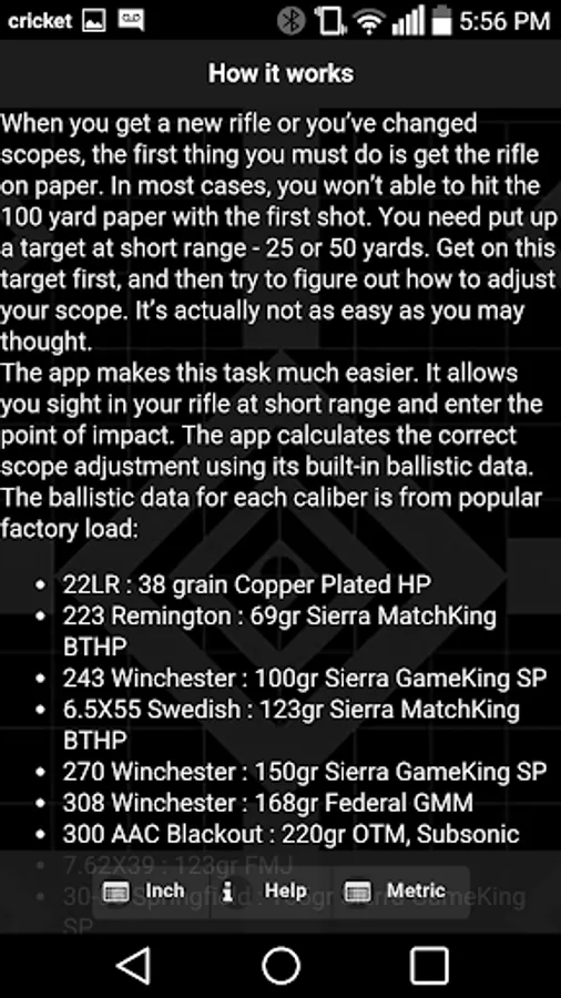 This app is not another ballistic calculator, it was designed especially for sighting in new rifle and optics and extremely easy to use. The ballistic data is from the most popular standard factory loads, 168 grain Federal Gold Medal Match for example. They may not the exact match with your firearm and ammo configuration, but should be close enough get you on paper really quick.