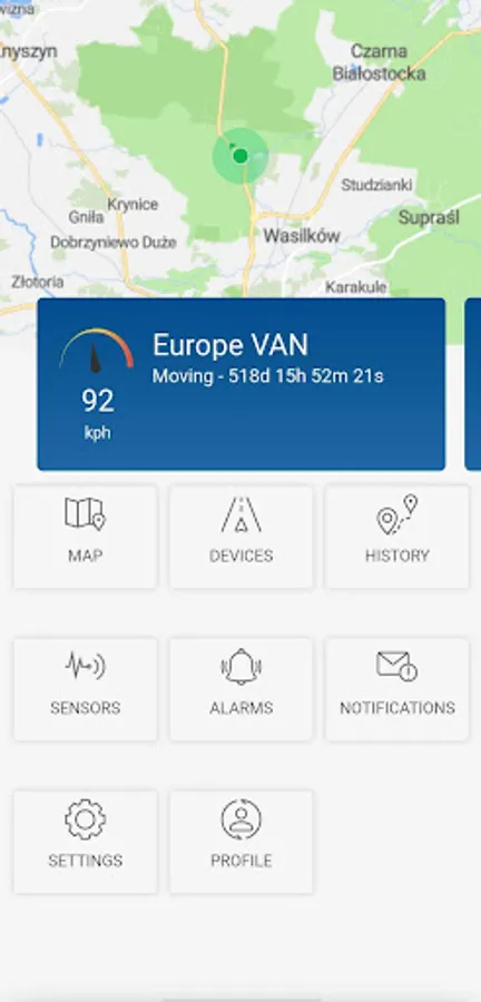 · Dashboard - View a summary of all vehicles, quick view map, and access the menu,