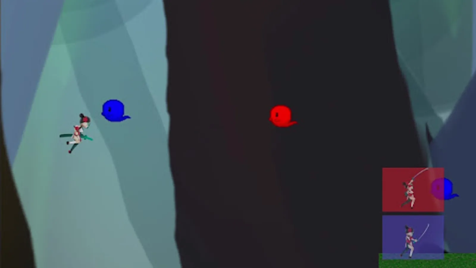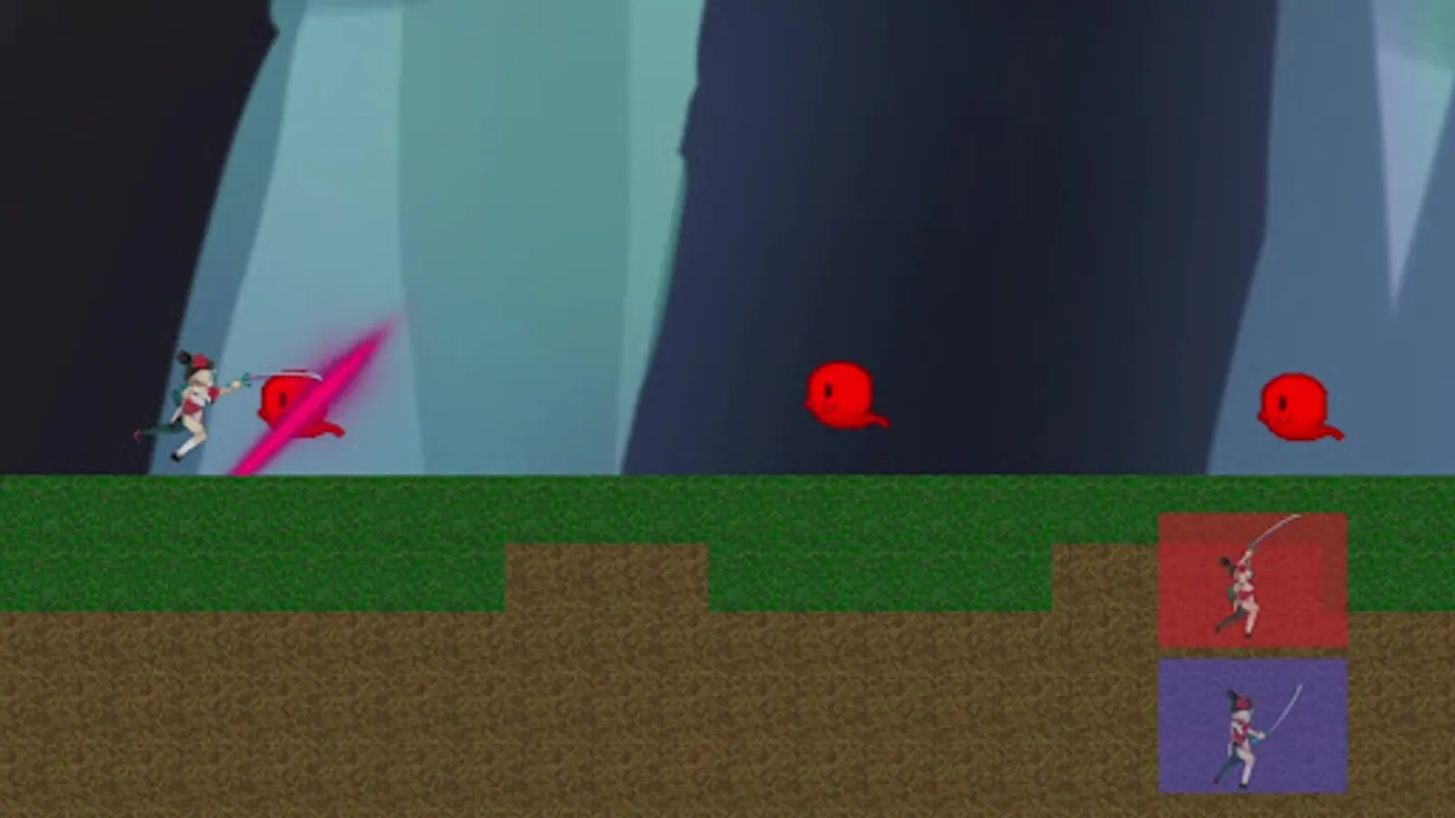 An automatic side-scrolling action game. Press the button that matches the color of the enemy to cut the youkai at the right time and proceed!