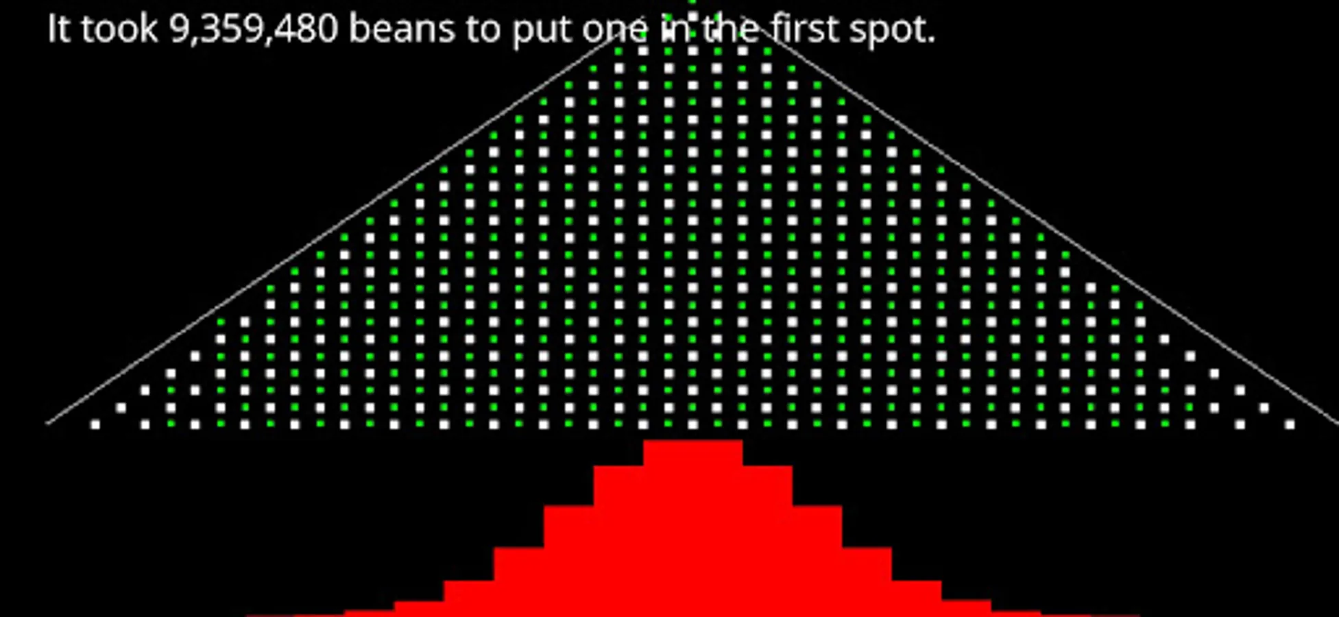 This app simulates a Galton box, but it does it *very* fast. It can move millions of beans 60x a second or more (depending on your device). The simulation stops when the first bean hits the first column on the left. The stacks below the machine illustrate the number of beans that were dropped in each individual column. When enough beans fall down, the shape of the stacks approximate a normal distribution (also known as a Gaussian distribution or The Bell curve).