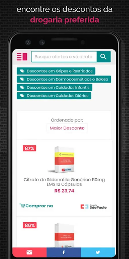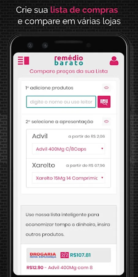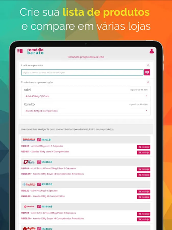 2. Also take the opportunity to save time and money with our Smart Shopping List, which is able to compare your product list and presentations in several drugstores at the same time, a real novelty in Brazilian e-commerce; download your new drug price comparison app now.