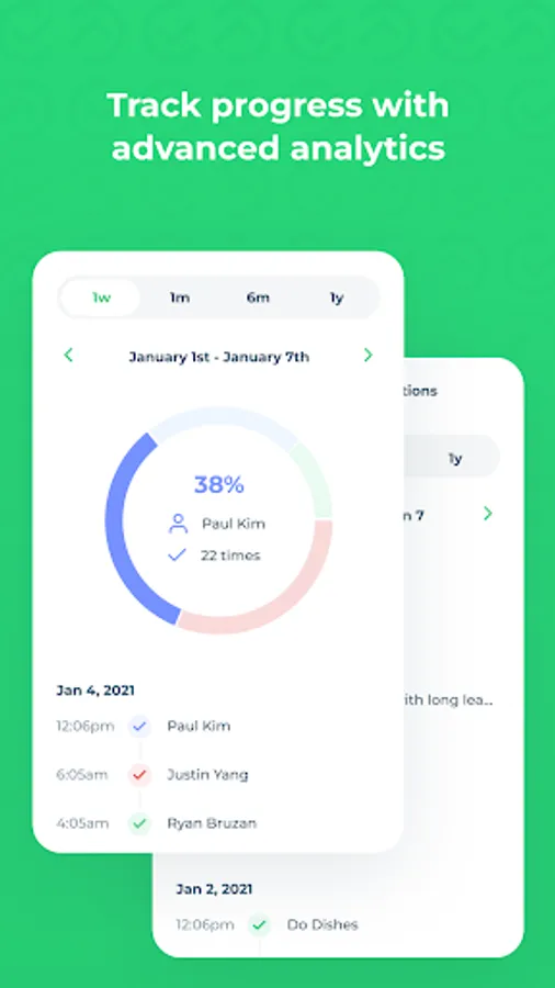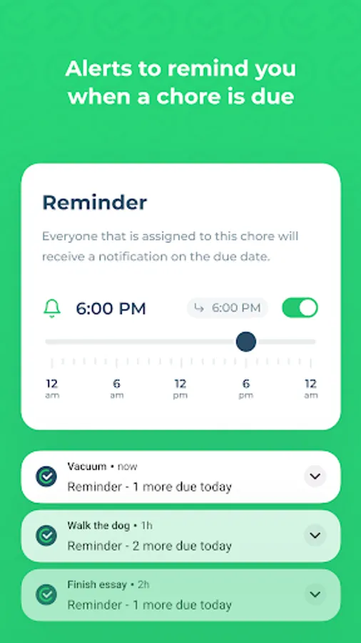 Receive alerts, reminders, or notifications for your recurring or one-time chores, reminding you when to complete your assigned task. Switch back and forth between list view / chart view and calendar view according to your preferences. You can also track progress through our advanced analytics, showing who completed what at what time and on what day. Complete each chore in your chart by sliding your finger across to check off what you’ve completed on your checklist.