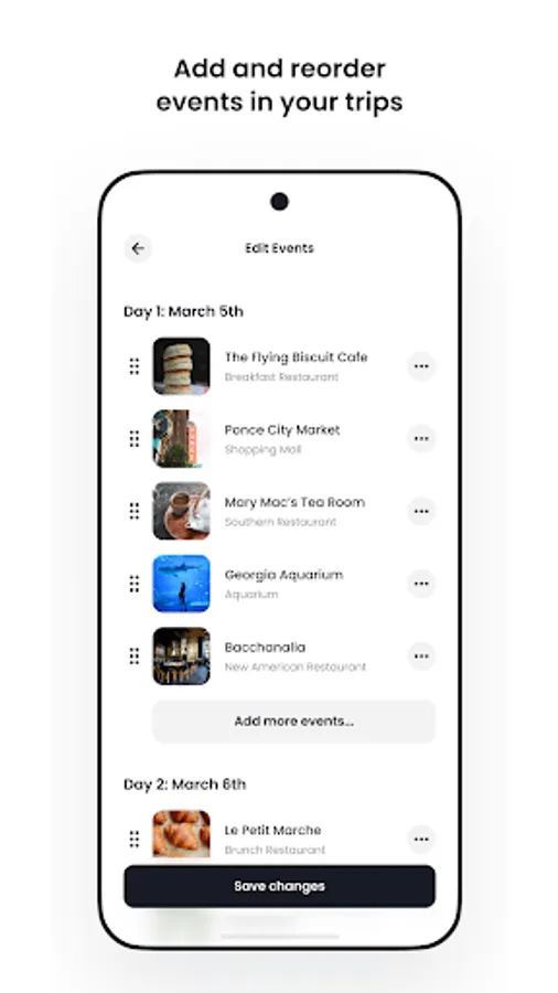 Not feeling the AI's recommendations 100%? No problem! Drag to reorder events and even add them manually as your browse through top attractions and restaurants in your chosen city! This way, you can utilize our powerful AI while also personalizing your trip yourself!